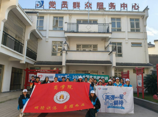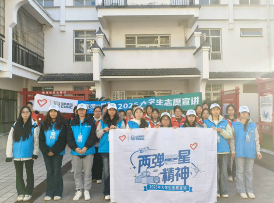 活动伊始,志愿服务队在胜海社区党员群众服务中心门前整齐列队,展开“‘两弹一星’精神2025年大学生志愿宣讲”主题横幅并合影留念。队伍前方,商学院“明经识济求理尚道”的院旗迎风飘扬,展现出商院学子弘扬科学精神、勇担时代使命的坚定信念。