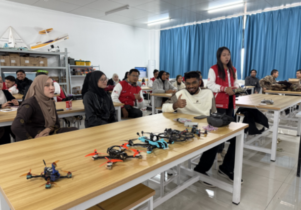 课程内容精心设计了“无人机基础认知”、“模拟飞行训练”、“编队飞行演练”以及“组装调试实践”等核心模块,教学环节层层递进、由浅入深,授课内容紧密贴合实际应用场景。在中方专业教师的耐心指导下,马来西亚学员逐步搭建起从理论知识到实操技能的完整学习链条,一步步解锁无人机操作的核心要领。“从零部件组装到成功调试起飞,每一个环节都充满挑战与收获,这让我对中国无人机技术的实际应用有了更深刻的理解,这段经历太宝贵了!”马来西亚学员Sueshan在完成无人机试飞后,难掩兴奋地分享道。