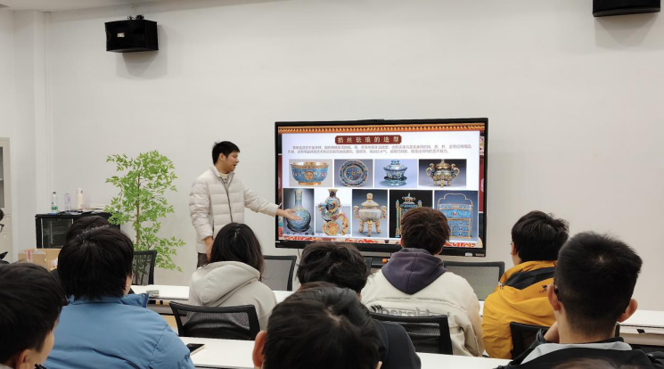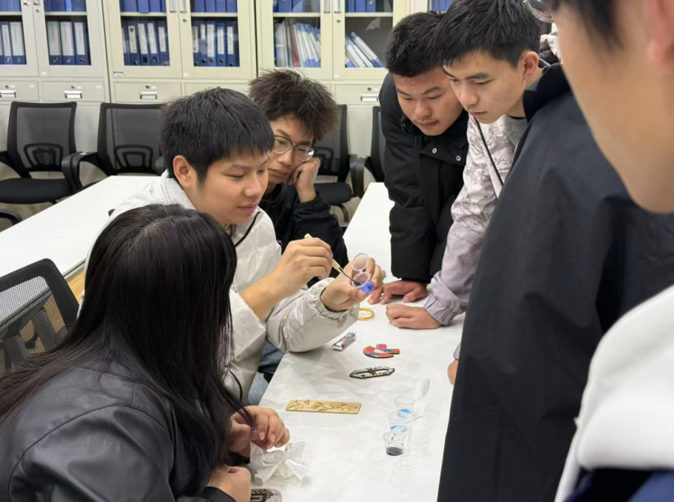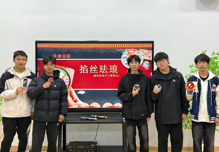 活动伊始,辅导员熊量笙从历史源流讲起,为同学们揭开了这项国家级非遗的神秘面纱。“掐丝珐琅又称景泰蓝,是我国传统工艺的瑰宝。”在他的演示下,掐丝、上色等核心工序依次展开,细如发丝的铜线在指尖弯折流转,展现着传统工匠对细节的极致追求。