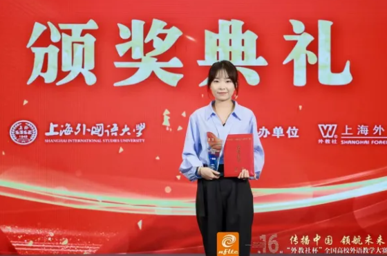 “外教社杯”全国高校外语教学大赛是由上海外国语大学主办,上海外语教育出版社承办的全国高校外语教学赛事。本届大赛以“传播中国,领航未来”为主题,分为综合课组和视听说课组,来自全国各省区市的58位优秀参赛教师,在两天半时间里,通过授课、说课、回答专家提问等环节的比拼,角逐大赛最高奖项。最终,曾御江洪以第四名的成绩荣获一等奖。