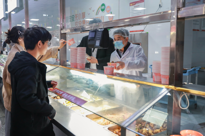 丰收节免费窗口前,副校长陈磊身着工作服为师生打菜添饭,不时询问学生种植心得,现场氛围热闹而温馨。