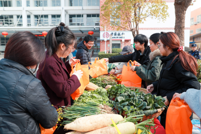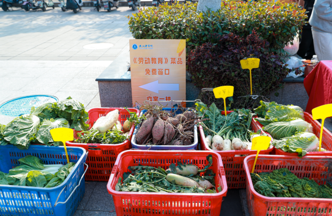 “这个红烧萝卜丸子好好吃!”“这个汤煲得真到位,萝卜尝起来非常鲜!”12月9日中午,武汉商学院北区食堂“丰收节限定”免费窗口前排起了长队,同学们有序领取萝卜烧鸭块、白萝卜炖五花肉等特色菜肴。30米外的食堂门口,各色蔬菜有序陈列,师生可以挑选带走。据悉,这些菜品的原材料均来自该校学生劳动教育课上种植的蔬菜,本次丰收节成果有22000斤,涵盖萝卜、红菜苔、紫苏等20多个品种的蔬菜,经食堂精心烹饪,免费供应给全校师生品尝,共同品尝香甜的劳动味道。