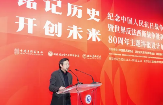 12月9日下午,铭记历史·开创未来——纪念中国人民抗日战争暨世界反法西斯战争胜利80周年主题海报设计展在湖北美术学院美术馆开幕。展览由中国美术家协会、湖北省文学艺术界联合会、湖北美术学院联合主办,《美术》杂志社、湖北省美术家协会、中国美协平面设计艺术委员会、中关村云通计算机专业服务器系统技术创新联盟承办。