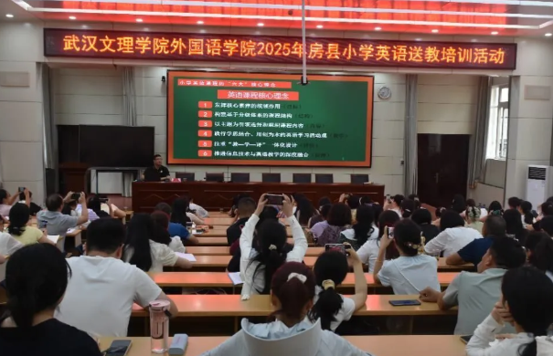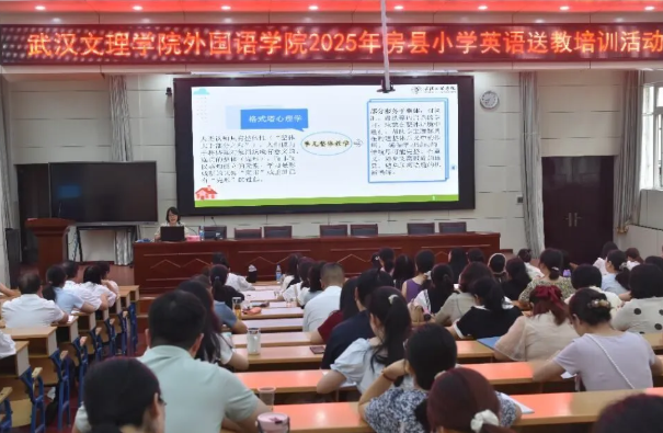 为持续推动城乡教育均衡发展,切实提升基层学校课堂教学质量,近日,武汉文理学院外国语学院组织骨干教师团队赴十堰房县实验小学,为当地百余名教师开展英语送教下乡培训专题活动。本次活动以“精准赋能、共促提升”为核心,通过专题讲座、示范课展示、互动研讨等多元形式,为两地教育工作者搭建了深度交流的专业平台,助力房县小学英语教学提质增效。