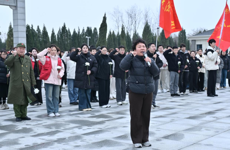 上午8时,师生代表徒步前往陵园。行进途中,党员同志讲述红色故事,将路程转化为一堂生动的“移动党课”。抵达后,全体人员肃立默哀,表达对烈士们的深切哀思与崇高敬意。面向鲜红党旗,全体党员重温入党誓词,誓言铿锵,信念如磐。随后,大家缓步绕行,瞻仰烈士纪念碑,感悟先烈不畏牺牲、英勇奋斗的伟大精神。
