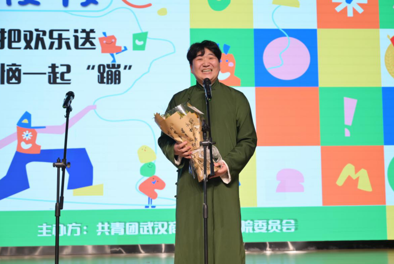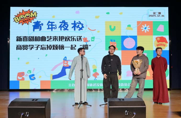 12月16日晚,武汉商贸职业学院礼堂内笑声与掌声此起彼伏。由学校2020级播音主持专业毕业生郭旭阳创立的“蹦蹦喜剧”团队重返母校,为第二期“青年夜校”带来了一场别开生面的喜剧专场演出。近300名师生汇聚一堂,在轻松欢快的氛围中共同度过了一个充满笑声的夜晚。