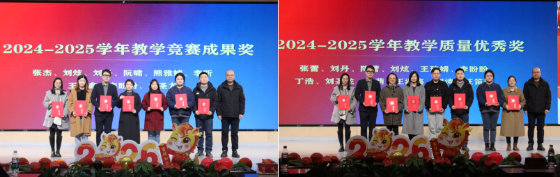 精彩的表演过后,晚会进入隆重的颁奖环节。由校党委书记杜永成分别为“教师教研成果奖”和“教师科研成果奖”获奖教师颁奖。其中,“教师教研成果奖”一等奖由王淋鑫老师获得,陈蕾、魏紫熙老师获二等奖,刘圣龙、沈瑾、余芬老师获三等奖;“教师科研成果奖”一等奖由张蕾老师获得,丁浩、王玮婧老师获二等奖,李昕、李盼盼、刘涛老师获三等奖。教学副院长刘炫为“青年教师教科研成果奖”获奖教师寇玉典、汪泉、张杰颁奖。