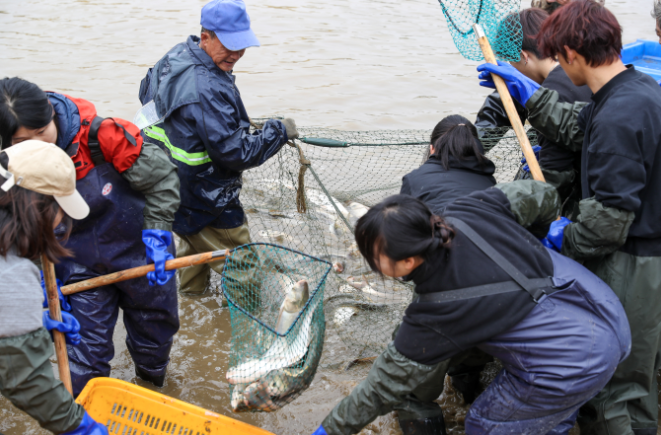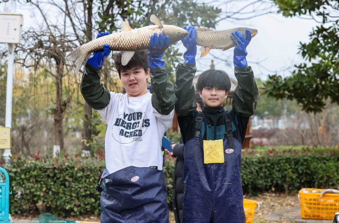 活动现场,学生们分成若干小组进行安全培训、穿戴防水服,在学校后勤与基建管理处工作人员的指导下有序拉网、收鱼。“加把劲,马上就能下水捞鱼咯!”随着渔网缓缓收紧,银鳞闪烁的鲜鱼在网中翻腾跳跃,参与活动的同学迫不及待地拿起抄网,下水捞鱼。“鱼来啦!快拿个新箱子,这个要装不下了。”体育学院·国际马术学院的郑梓岩提着满满一网兜鲜鱼上岸,岸边响起阵阵欢呼。