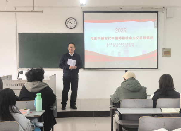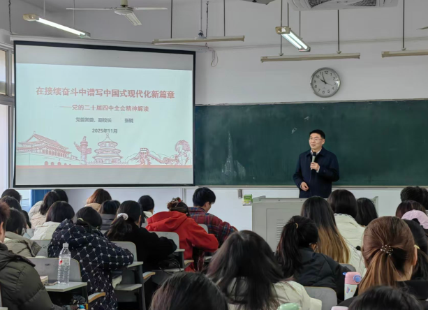 党委副书记、副校长黄悦华采取“先听课、后讲课”的沉浸式教学方式,精准对接学生思想实际。他以深入学习党的二十届四中全会精神为主线,从“五个讲清楚”的系统维度展开授课,并针对前期调研中学生关注的热点难点问题,运用最新素材与案例进行靶向释疑,让党的创新理论在回应现实关切中彰显真理力量,有效践行思政育人的启智润心。