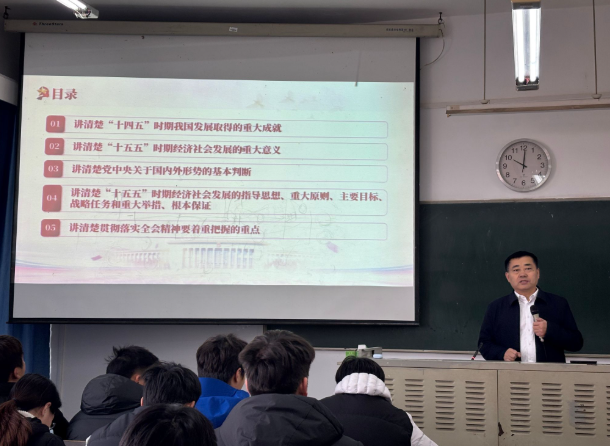 党委常委、副校长张成以“在接续奋斗中谱写中国式现代化新篇章”为题,系统解读国家未来五年的发展蓝图。他结合学校“十四五”成就与“十五五”愿景,深刻阐述高校在新征程中的使命担当,激励学生将个人理想融入中国式现代化的宏伟实践,在专业领域深耕细作,以过硬本领服务国家发展大局,践行“强国有我”的青春誓言。