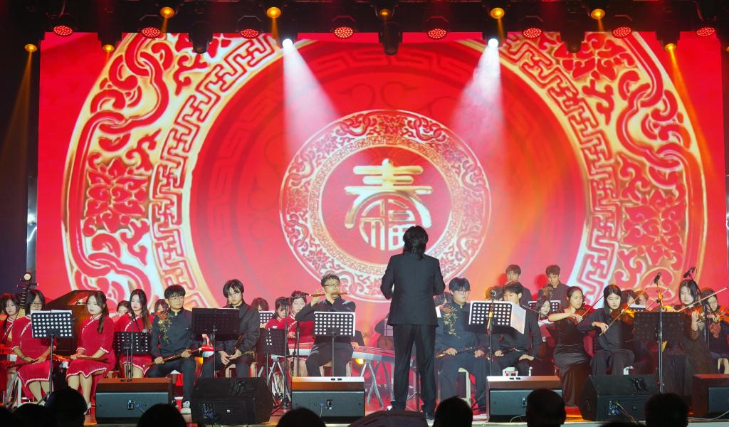 晚会在武汉音乐学院演艺学院与武汉商贸职业学院大学生艺术团器乐队合作的《春节序曲》中拉开序幕,激昂恢宏的旋律瞬间点燃全场气氛,充分彰显了两校合作的艺术高度与融合活力。