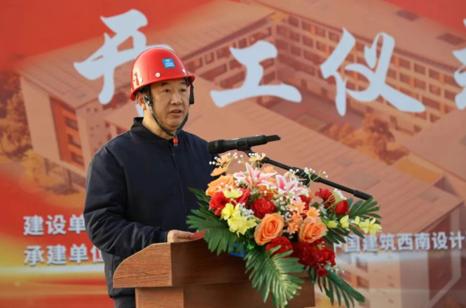 周慎校长代表学校党委和行政对出席开工仪式的各位领导、来宾表示热烈欢迎,向为项目建设付出辛勤劳动的同志们表示衷心感谢。他指出,先进制造产教融合实训基地是学校“十四五”发展规划的重点工程,将建设船运、物流与智能制造三大产教融合基地,改善航空航天智能制造、智能绿色船舶制造生产服务型物流等专业领域实习、实验、实训条件,推动学校产教融合高质量发展。该项目不仅能优化校园布局、改善师生教学科研环境,更能为学生实习实训、创新创业搭建平台,助力学校对接“交通强国”战略,服务湖北和武汉的发展建设,成为学校提升办学实力的新支点。周慎校长对项目建设提出三点明确要求:一是施工单位要坚守“质量为上、安全第一”,监理单位严把工程质量与进度关,二是学校各部门及参建单位需加强协同配合,保障工程顺利推进,三是建设过程要秉持绿色环保理念,采用新技术新工艺,打造优质、廉洁、阳光工程,期待基地早日竣工投用,为学校建成国家双高校注入新动力。