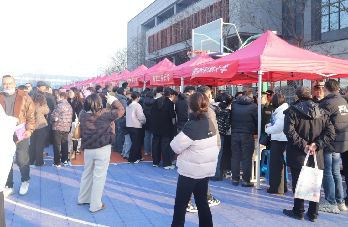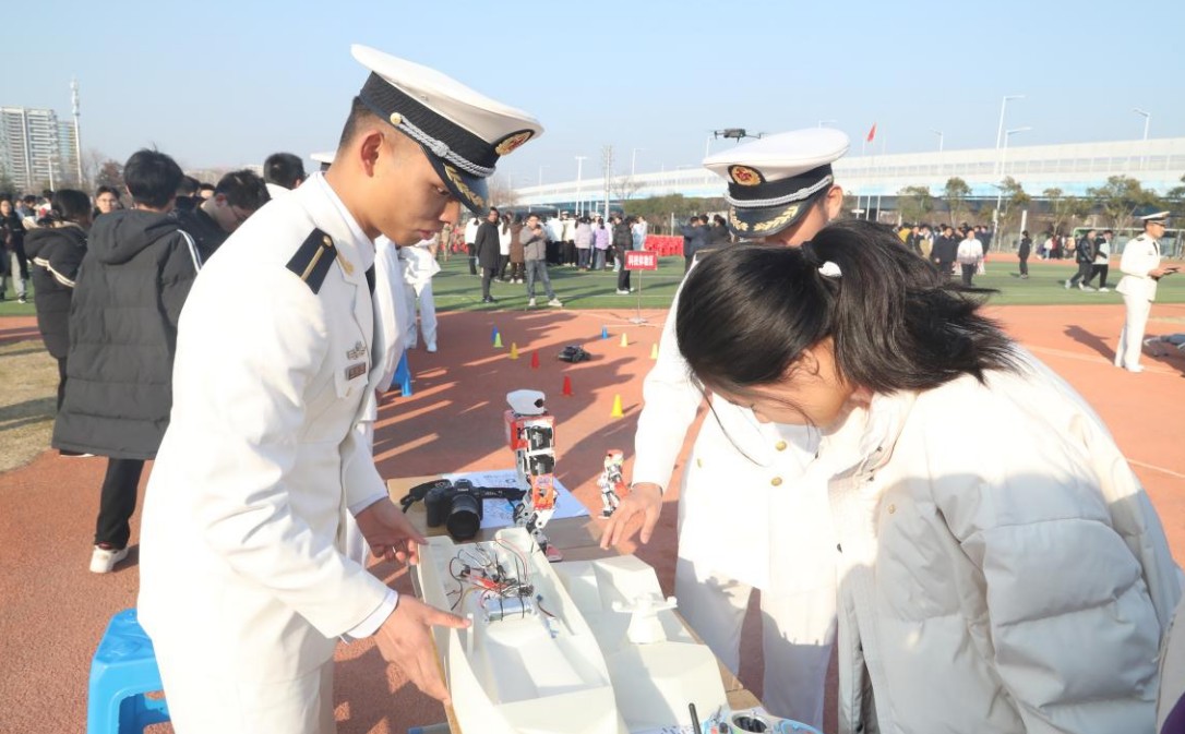 仪式结束后,学生与家长代表前往具有海军特色的各展区参观体验,现场气氛格外热烈。政策宣讲区内,20所军校现场设点,讲解员介绍办学特色与招生政策;科技体验区中,无人机、智能车、格斗机器人等智能装备现场演示,彰显国防科技魅力;海军特色展示区里,学员借助3D打印舰艇模型讲解海军装备,传授绳结、旗语、礼仪等技能,并分享远海实习故事;军事技能体验区则设有模拟射击、战术格斗、战伤救护等项目,让学生近距离体验军事训练。