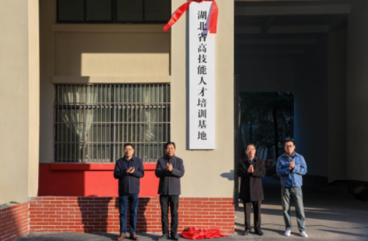 长江新区社会事业局就业科科长毛明亮,武汉生物工程学院理事长、校长余毅,校党委书记、常务副校长江珩,校理事会秘书长、校委会副主任蔡红生为湖北省高技能人才培训基地揭牌