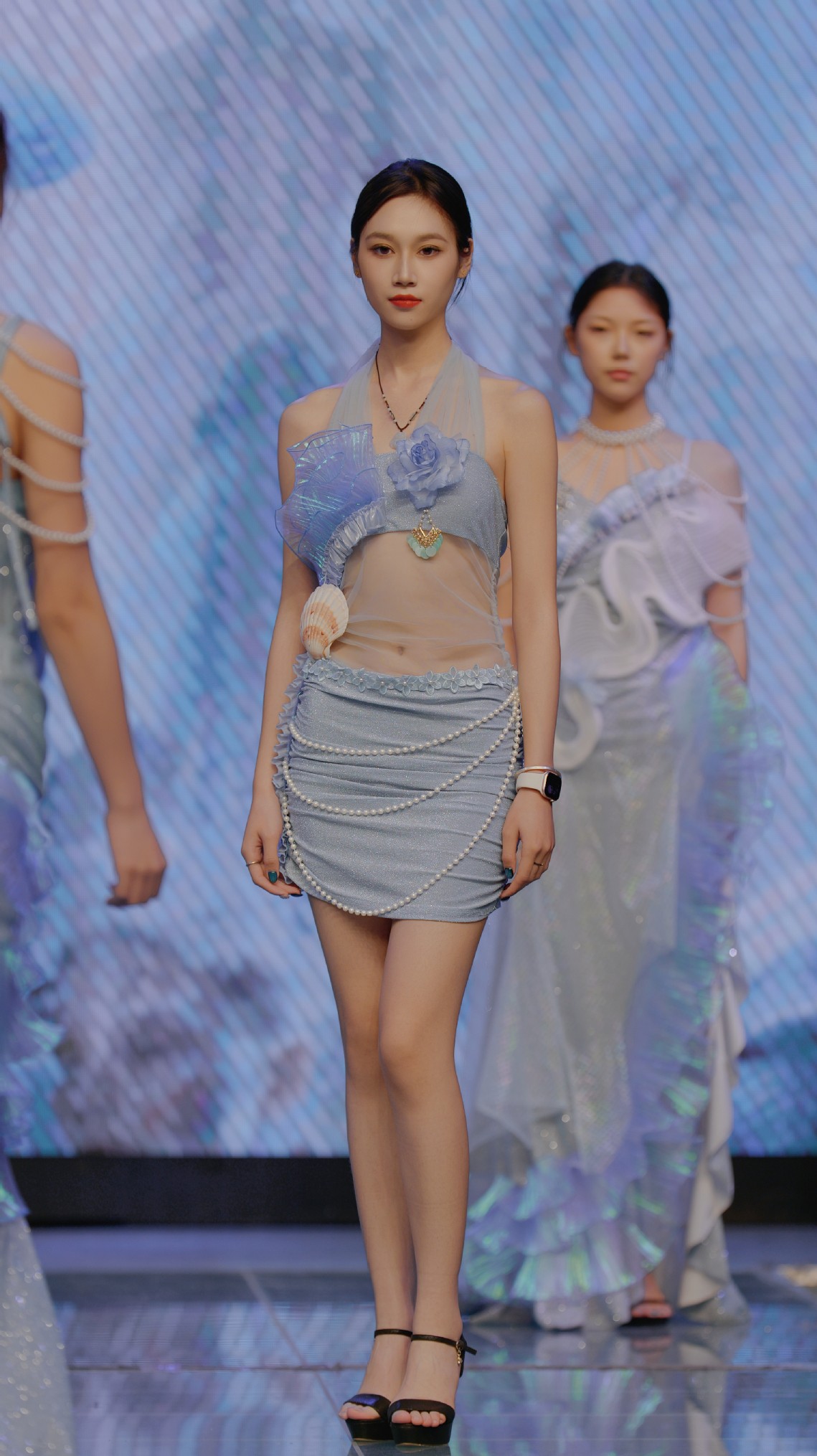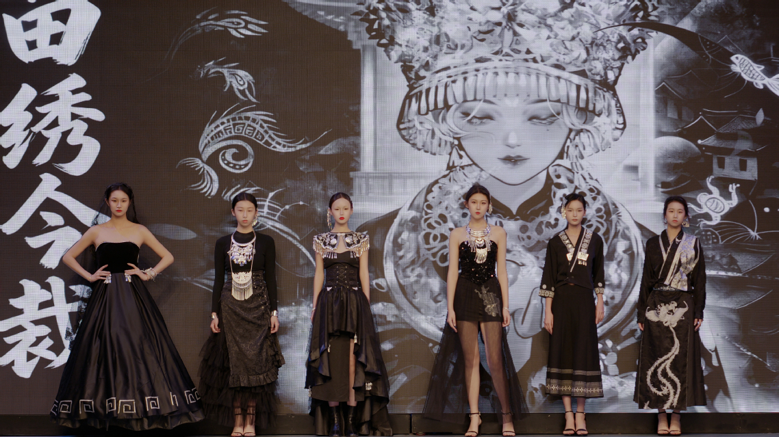 动态秀集中呈现了《解构查尔瓦》《浪舞潮汐,听海》《墨韵革华,袂映新章》《皮影》《金叙》等十余组毕业设计系列。从非遗传承、可持续时尚、国潮创新、数字融合、海洋保护等多个维度展开创作实践。《解构查尔瓦》以当代设计语言重构民族传统披毡;《浊洋》将海洋废弃物料转化为服饰元素,传达生态保护理念;《银绣新序》推动苗绣工艺融入现代生活语境;《织暗时刻》则借哥特美学演绎暗黑设计哲学......这些作品不仅体现出学生们在文化传承、科技应用与设计表达上的深入探索,也生动诠释了传统与未来、技艺与观念在时装创作中的融合共生。