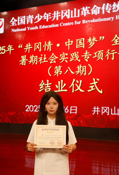 让她成长最快、感触最深的,是2025年暑假的井冈山社会实践。作为学校首批入选团中央专项实践团队的一员,她在井冈山度过了9天。“和很多优秀高校的同学一起实践,看到了差距,也更激发了动力。”那段日子里,团队为了完成调研报告和成果展示,经常熬夜。“那是一段身体很累、但精神特别充盈的时光。”