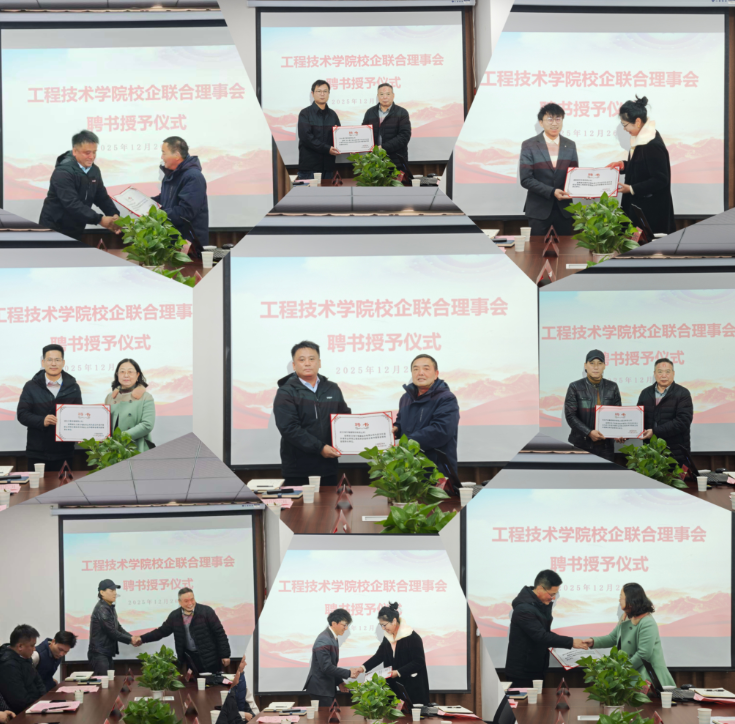 大会现场还举行了校企合作理事会聘书授予仪式,校领导及工程技术学院领导为5家常务副理事长企业颁发聘书。