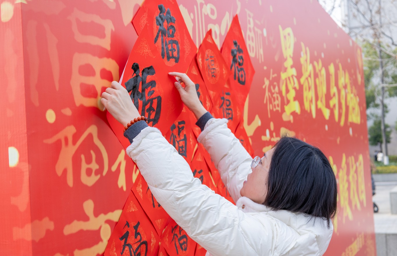 笔走龙蛇间,红纸黑字流淌出吉祥与祝福,一个个生动饱满的“福”字跃然纸上,一副副寓意美好的春联承载着新岁期盼。现场特设的书写体验区与“百福图”集体创作区,也吸引了众多师生驻足参与,有人凝神临摹,有人畅意挥毫,每一笔落纸都承载着真挚的新春心愿。现场笑语不断,墨香与浓浓年味交织。