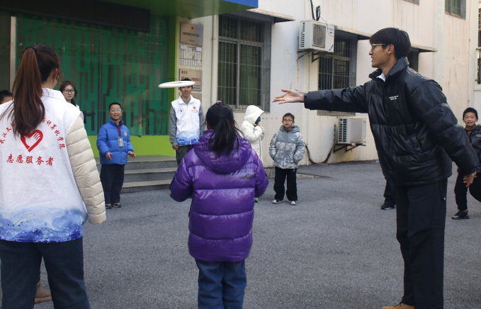 除了室内精彩的跳跳棋游戏,团队成员们还带领孩子们来到了空旷区域,玩起了活力四射的飞盘游戏。
