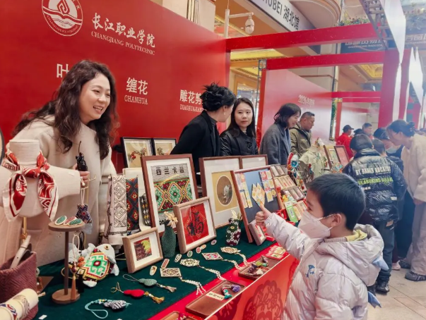 走进长江职业学院展区,叶画、缠花、西兰卡普、雕花剪纸等作品琳琅满目,吸引市民层层围观。小学生踮脚细看缠花发簪,年轻女性试戴绒花胸针,一位小朋友在选购心仪的西兰卡普小马挂件后,向现场讲解的老师竖起大拇指:“阿姨做的真好看!”。仅半天时间,缠花饰品售出20余件,西兰卡普系列文创售出31件,热度可见一斑。