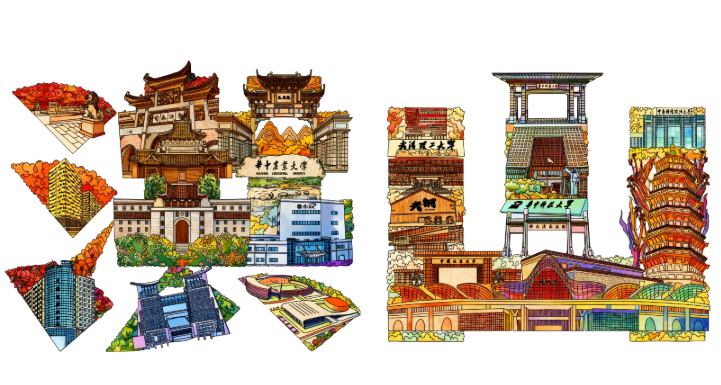 作为主创学生,钟佳敏在分享创作感想时表示,她和徐郑冰老师在历时半个月的创作中,着力将洪山那些“熟悉的地方、学校、企业都揉到画里”,让观者一见即生共鸣。她特别提到,作品中融入的华中农业大学校门、华中师范大学主楼等高校建筑,“不只是房子,更是一代代学子的青春记忆”;而马应龙、烽火创新谷等企业与园区,则代表着洪山产业发展的缩影与活力;武汉火车站、卓刀泉寺等新旧地标并列,则隐喻着洪山“既守着根,又往前冲”的发展姿态。她希望通过这组作品,“让不管是住在洪山的,还是在洪山上学、上班的人,都能找到共鸣,知道这些地方共同构成了我们生活的这片热土”。