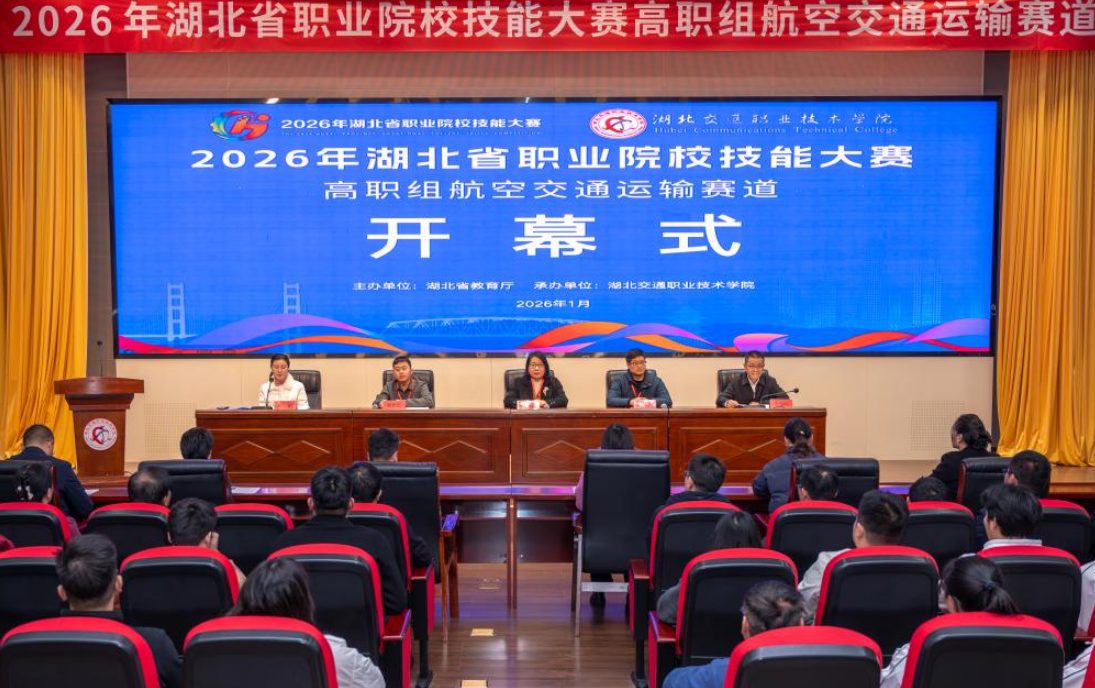 1月16日至18日,2026年湖北省职业院校技能大赛高职组航空交通运输赛道在湖北交通职业技术学院举行。赛道裁判长刘树聃,赛道监督长苏雅靓,赛道仲裁长王晓磊,赛道组委会副主任、湖北交通职业技术学院副校长李建明及各裁判、参赛领队、指导教师、选手出席开幕式。