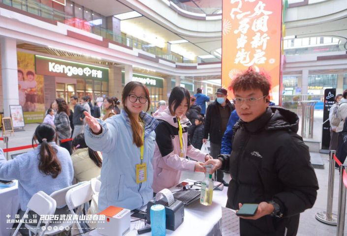 赛事启幕前一日物品发放会(1月17日),武商MALL·众圆中庭内街早已被志愿红点亮。上午9时未至,120名志愿者已完成最后一遍流程彩排,将物资发放的每一个环节打磨至极致。身份核验台、服装发放窗口、参赛包领取处、芯片检测岗、咨询台依次排开,标识清晰明了,为跑者搭建起高效便捷的领物通道。志愿者们细心地将号码布、能量胶、印着“新春快乐”的纪念福袋一一分装,服装发放岗的同学有条不紊地核对尺码、登记确认;男生志愿者主动扛起成箱的物资在货架间穿梭,芯片检测岗的伙伴则逐一枚核验计时芯片,杜绝任何疏漏。指尖划过冰凉的水瓶,耳边交织着清点声与核对声,当最后一份参赛包贴好封条,商场暖黄的灯光落在众人汗湿的发梢,这份忙碌里,藏着对次日赛事的热切期盼与十足底气。