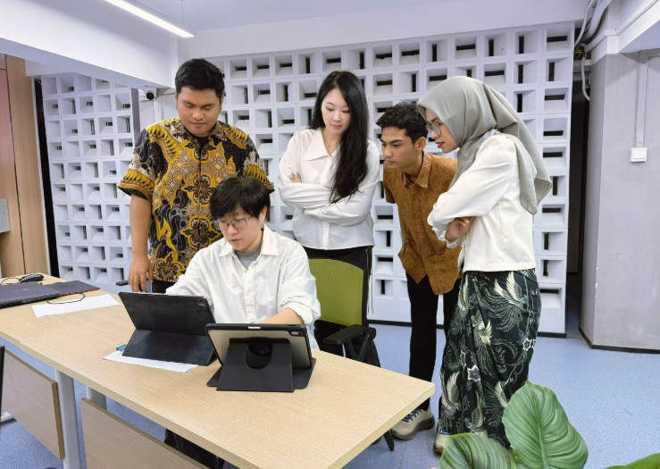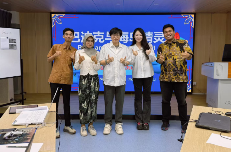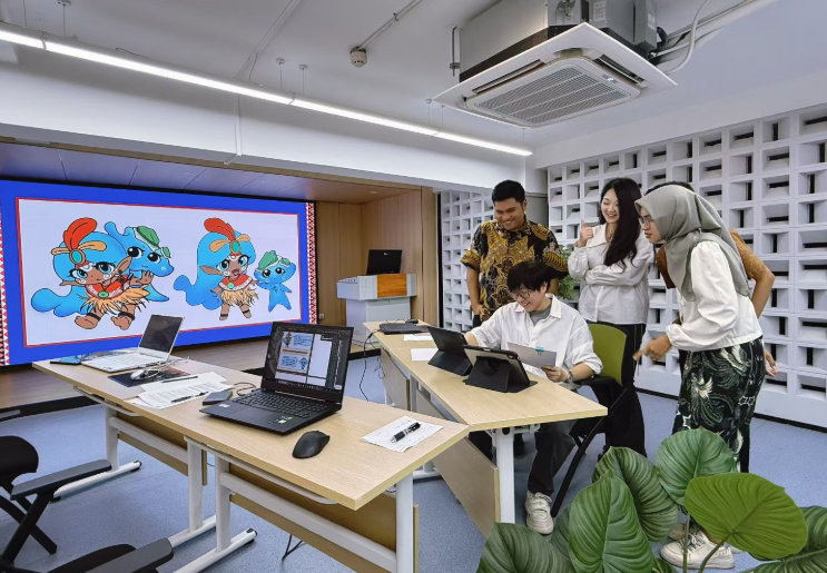 备赛过程中,团队克服跨文化差异、语言沟通等多重挑战,构建起“技能互补、文化互鉴、高效协同”的合作模式。指导教师董倩全程深耕细作,将艺术设计专业教学与跨文化协作指导深度融合,带领团队从资料收集、创意构思到作品落地全程攻坚。留学生们凭借对本土文化的深刻理解,精准提炼印尼巴迪克纹样、自然崇拜等文化符号;该校学生则发挥专业技术优势,助力IP形象设计与3D模型创作,双方在协作中碰撞灵感、精进技能,完美诠释了“职业技能+跨文化协作”的培养理念,展现了新时代国际青年的协作精神与专业素养。