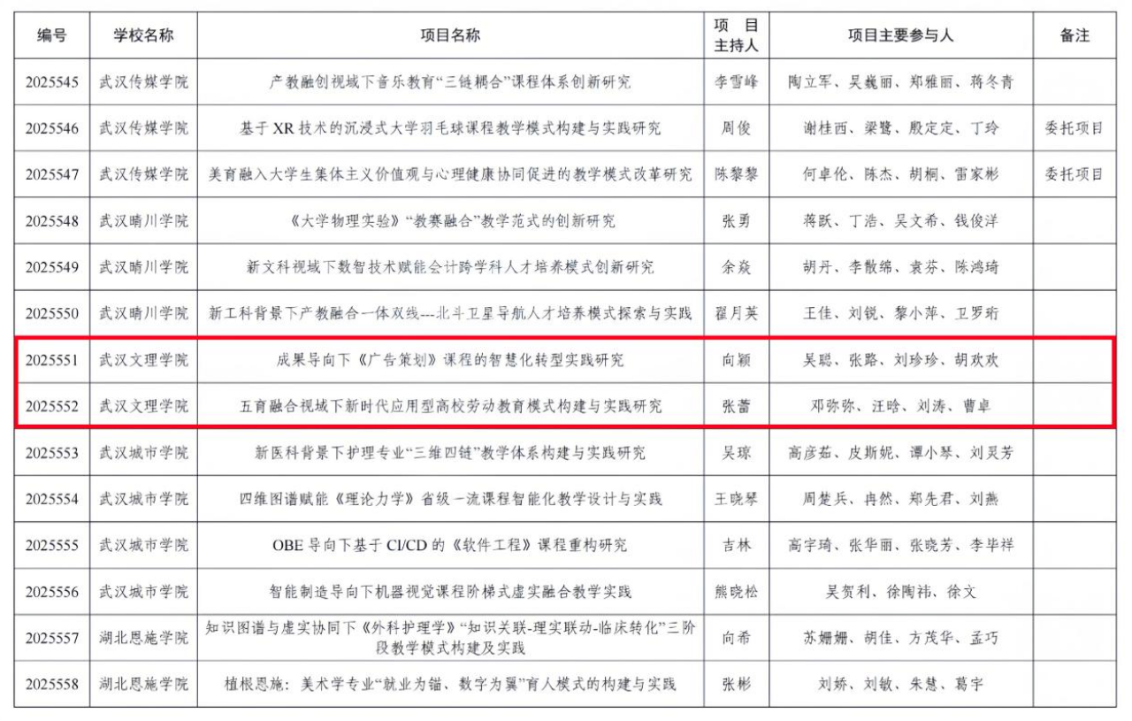 近日,湖北省教育厅正式发布《省教育厅关于公布2025年湖北本科高校省级教学改革研究项目的通知》(鄂教高函〔2025〕17号),武汉文理学院2项教学改革研究项目成功获批立项。