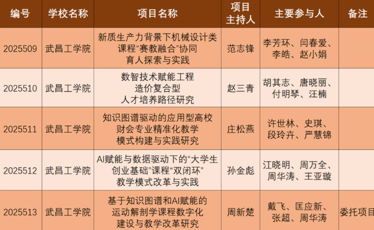 近日,湖北省教育厅发文公布了2025年湖北本科高校省级教学改革研究项目立项名单,武昌工学院《新质生产力背景下机械设计类课程“赛教融合”协同育人探索与实践》等5个项目获批立项,其中1项为委托项目。