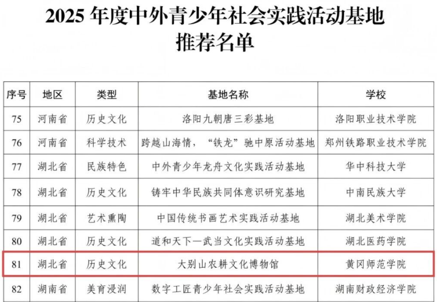 受教育部国际合作与交流司委托,中国教育国际交流协会2025年面向全国开展了来华留学生了解中国优秀课程和中外青少年社会实践活动基地征集工作。经黄冈师范学院申报、湖北省教育厅推荐、专家审核,黄冈师范学院大别山农耕文化博物馆成功获批全国中外青少年社会实践基地,成为湖北省5个、全国124个中外青少年社会实践活动基地之一。
