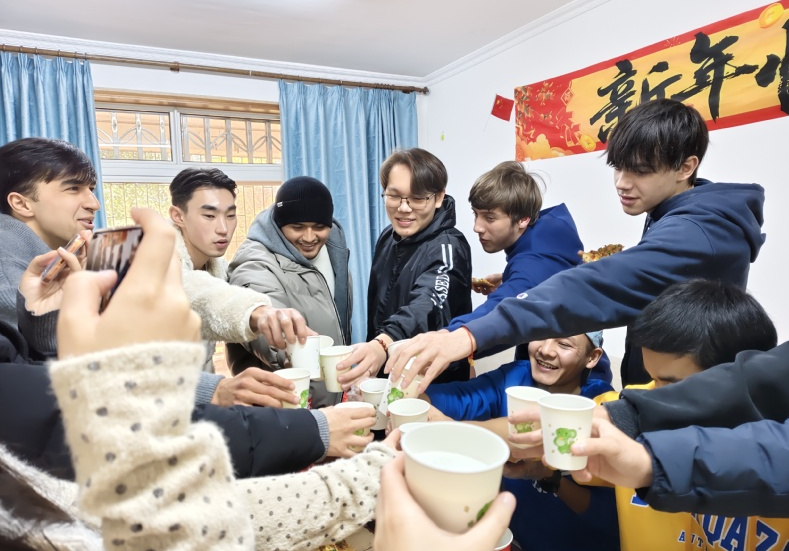 来自乌兹别克斯坦的凯文尝着热气腾腾的饺子,开心地分享:“我最喜欢的中国美食就是饺子,今天了解到它象征着团圆与吉祥,吃起来更有意义了。”来自哈萨克斯坦的文奕雄在尝到新疆特色馕饼时,当即想起了家乡的传统面食,兴奋地和大家分享着两地面食的相似之处,还不时拿起手机记录下聚餐的温馨场景,让这份跨文化的味觉共鸣与节日喜悦,随镜头定格。