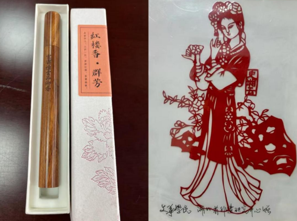 北京曹学会执行副会长位灵芝向文华学院中文系赠送了《红楼梦》文创产品红楼群芳香,上有“室霭檀云品御香”,这句诗来自贾宝玉的《夏夜即事》,谭邦和教授代表非遗研究中心赠送了“史湘云”剪纸作品。座谈会在热烈的氛围中圆满结束。(通讯员:刘春景)