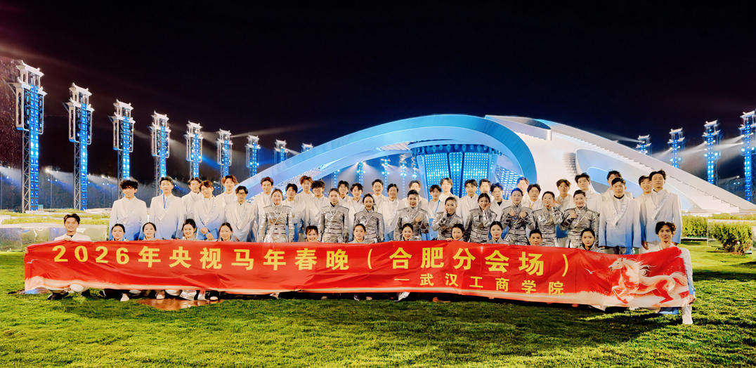 今年除夕,合肥分会场以《合韵满江淮》为主题惊艳亮相,将徽风皖韵的柔韧含蓄与“科创之城”的硬朗锋芒完美交融。在这场传统与科技交织的视听盛宴中,武汉工商学院承担了该节目的开场呼号、矩阵击缶、合唱伴舞三个板块的演出任务。开场呼号中,31名男生手持嵌入LED灯的蓝色道具伞,以安徽经典花鼓灯“闪、扭、倾”的灵动身段,与上千名演员共同组成气势磅礴的方阵;矩阵击缶的舞台上,20名女生身着银色紧身衣化身“科技战士”,以透明灯箱为鼓敲击出铿锵节奏;合唱伴舞中,30名男生手持发光小方块,光点随音乐律动与歌声交织成温暖画卷。