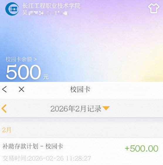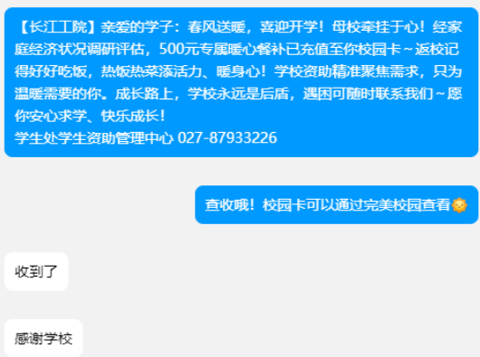 为让资助精准落地、高效暖心,学校学生资助管理中心通过严格审核、细致摸排,结合学生家庭经济状况与实际需求,精准确定帮扶对象。此次餐补500元直接充值至学生校园卡,流程简便快捷,切实缓解了学生开学期间在餐饮及日常消费上的压力,让资助举措既显实效,更有温度。