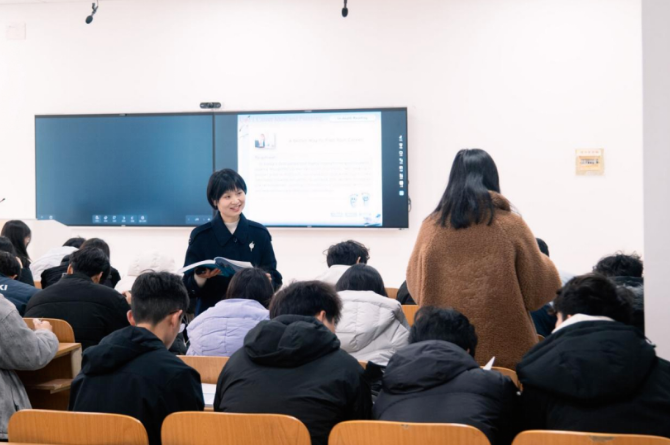 南3202教室,李旭晴老师轻触高清电子板,开启《大学英语》课程。课件流畅切换,板书可直接在屏幕上标注。“寒假有没有坚持学英语?”她以亲切的提问开场,同学们笑着回应。随后的词语训练中,李旭晴老师没有直接给出中文释义,而是引导学生用“英文翻译英文”的方式理解生词。讲到“constructive”时,她启发同学们联想“helpful”“useful”等近义词,鼓励大家用英语思维去理解和运用语言。