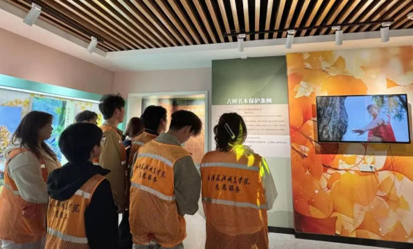 抵达汉阳树公园后,一行人首先来到园内的汉阳树科普馆。在馆内,大家通过翔实的图文资料和多媒体展示,深入了解这棵见证了武汉五百余年风雨沧桑的“汉阳树”的生长习性、保护知识及其深厚的文化底蕴。从明代古宅到今日城市地标,这棵古银杏树的年轮里镌刻着武汉的历史变迁,让在场的每一位师生都深感震撼,对即将进行的古树养护实践充满了期待。