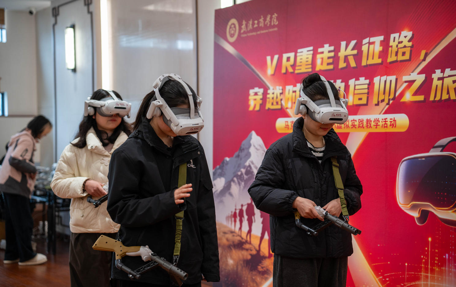 这是由该校马克思主义学院主办的“VR重走长征路,穿越时空的信仰之旅”虚拟实践教学活动。为纪念红军长征胜利90周年,该校引入20套VR设备,将思政课堂“搬”进历史现场,让广大师生在沉浸式体验中感悟长征精神。活动还设置了校际交流专场,武汉科技大学、武昌工学院等兄弟院校师生也受邀前来观摩体验。