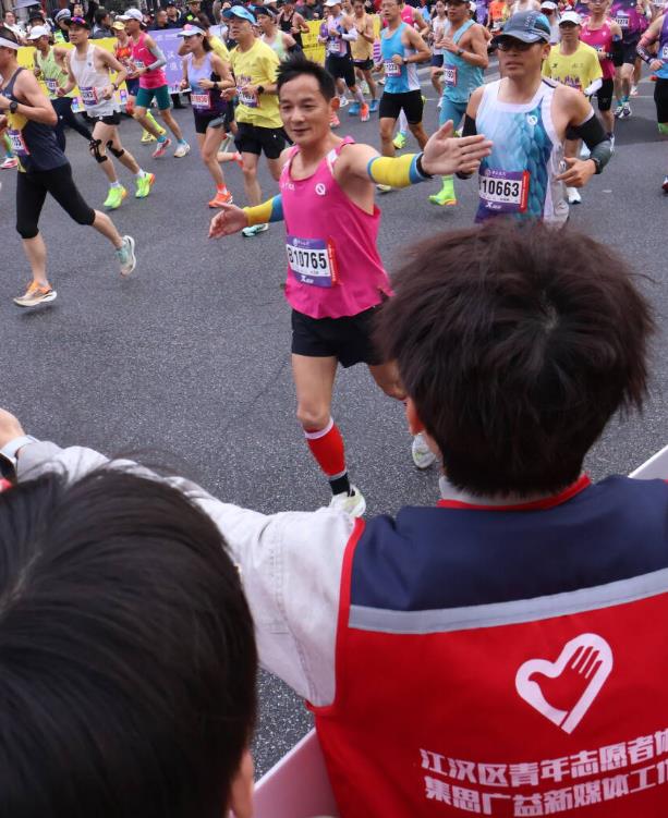 晨曦坚守,擦亮城市名片。 活动当天,志愿者们于清晨5点在江汉路集合,并迅速投入工作。随着发令枪响,他们手挽手筑起一道道稳固有序的“人墙”,高效引导人流,保障赛段秩序;同时,他们用最真挚的热情为奔跑的选手们加油助威。近一上午的站立与坚守,同学们始终精神抖擞、面带微笑,不仅圆满完成了保障任务,更将武汉的热情与城市的温度传递给了每一位参赛者和观赛市民。