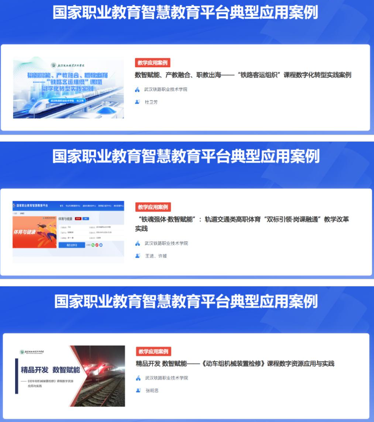 近日,国家职业教育智慧教育平台专题展示了2025年度全国职业院校典型应用案例,武汉铁路职业技术学院报送的3个教学应用案例全部成功入选,充分展示了该校在职业教育数字化转型工作中的突出成效与示范引领作用。
