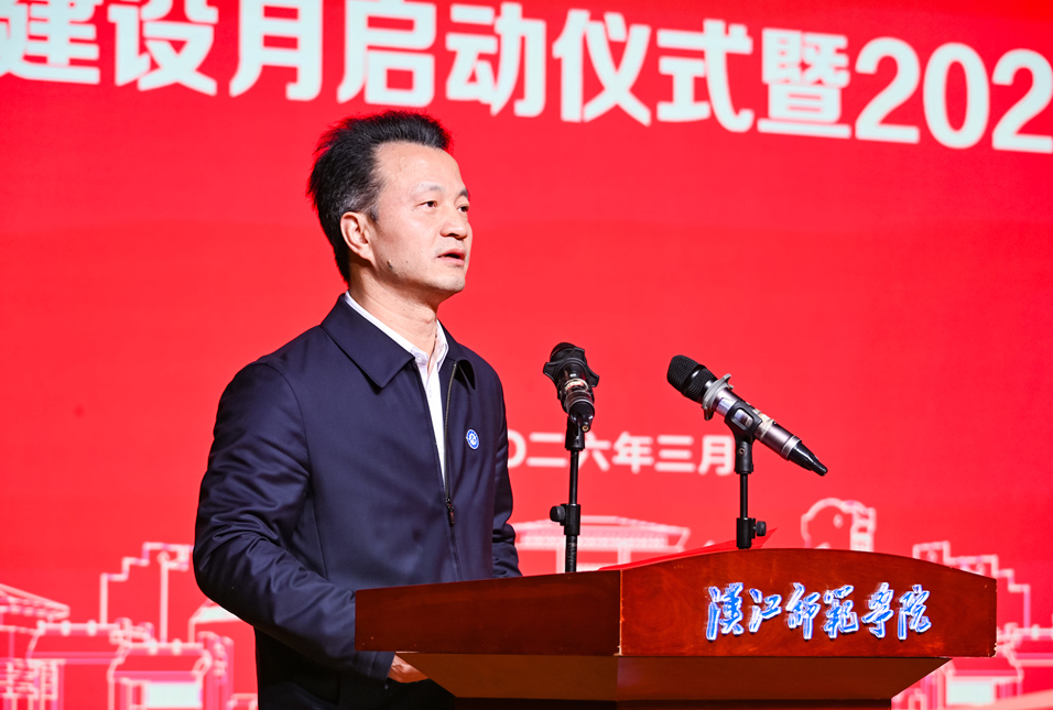 汉江师范学院党委常委、副校长吴红斌致辞。他指出,道德是民族精神的血脉,更是高校立德树人的根本。过去一年,学校在道德建设、学雷锋志愿服务、守水护水、生态文明实践等领域取得了丰硕成果。吴红斌对全体师生提出三点殷切期望:一是以德存心,在修身立德中筑牢思想根基;二是以德践行,在实干担当中彰显育人使命;三是以德聚力,在文明创建中谱写发展新篇。