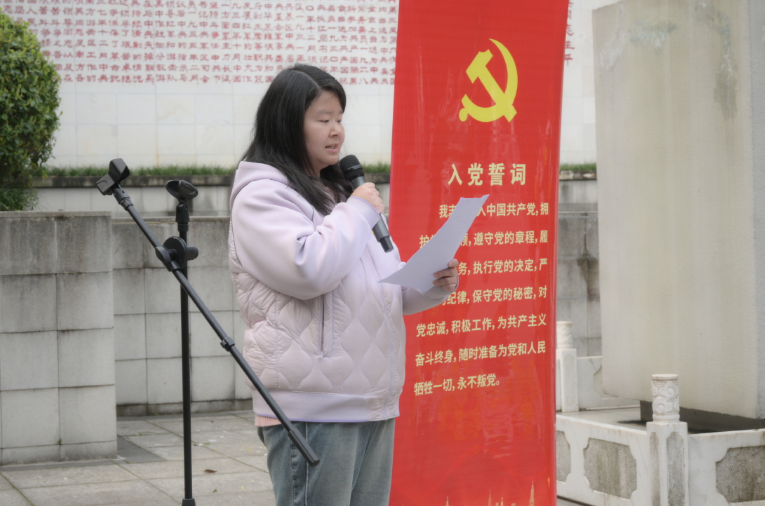 铿锵有力的誓言先后响起,领誓人分别是学院人工智能学生党支部副书记陈芷涵与学院分团委学生副书记李思彤。当最后一个音节缓缓落下,全场陷入短暂而庄重的肃静,仿佛连山风都停下了脚步,聆听这份穿越时空的承诺,感受两代人血脉相连的信仰传承。