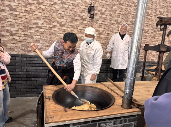手工制作环节中,同学们跃跃欲试、积极参与麻糖制作实践。在非遗传承人的悉心指导下,大家依次体验炒、揉、捏、压、切等传统工序,切身感受传统手工技艺蕴含的匠心与独特乐趣。随后,师生一行走进现代化生产车间,近距离观摩麻糖米酒标准化生产流程,直观感受传统非遗技艺与现代工业生产的有机融合,进一步加深了对非遗文化的理解与认同。