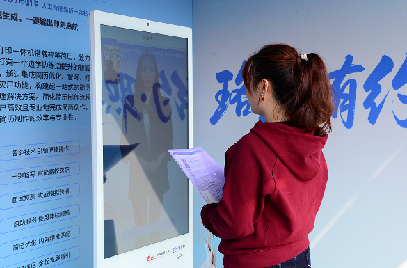 招聘会现场,“AI赋能区”成为亮点。简历打印一体机、落地面试一体机、就业赋能一体机三台设备协同服务,贯穿职业探索、简历优化、模拟面试到就业对接全流程。该区域以一站式智能服务,让毕业生在实战中获得即时反馈,在演练中补齐短板、提升自信,真正实现技术为人的成长与就业选择赋能。