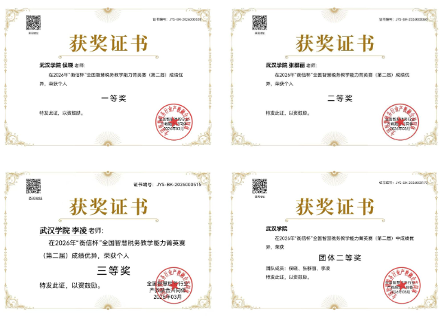 2026年“衡信杯”全国智慧税务教学能力菁英赛(第二届)近日圆满落幕。武汉学院金融与经济学院教师侯晓、张群丽、李凌,从2000余名参赛选手中脱颖而出,分别荣获个人总分奖一等奖1项、二等奖1项、三等奖1项。同时,三位教师凭借团队整体的优异表现,荣获团队二等奖,实现个人荣誉与集体荣誉的双丰收,充分展现了该校财税专业教师扎实的专业功底与卓越的教学实践能力。