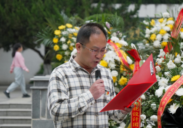 在“现场微党课”环节,人文艺术学院党总支书记谭辉军以“铭记”与“传承”为主题,为全体人员上了一堂生动的微党课。他勉励大家要将英烈精神转化为刻苦学习、报效祖国的动力,在校园中发挥先锋模范作用,争做时代新人。退役大学生代表阮航、刘琛懿结合自身从军经历和烈士事迹,分享了他们的成长与感悟。他们在烈士墓前讲述军旅岁月,表达对英烈的敬仰与对祖国的忠诚,现场气氛感人至深。