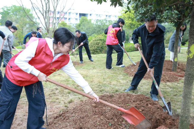 校党委书记孟武康、校长彭瑜等校领导带领师生挥锹培土、围堰浇水、挂牌留名。大家齐心协力,一株株红枫、紫薇、桂花迎风挺立,为校园增添勃勃生机。