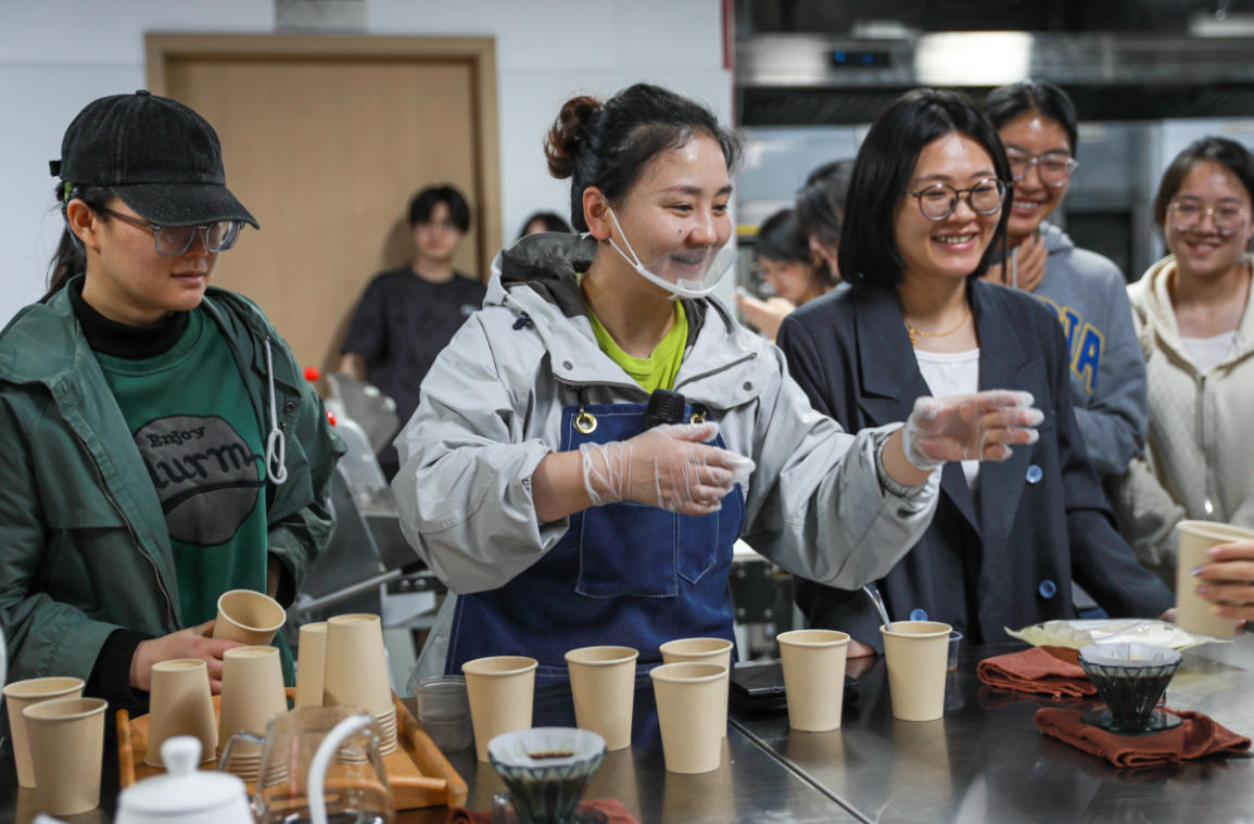 早在一周前的首次“鹤鸣日”,就已收获学生们的热烈反响。该校创意设计学院大二学生丁小涵如愿学到了心心念念的手冲咖啡课程。“这门课在学校特别火,选修的时候需要拼手速,我一直没抢到。”丁小涵说。学校“鹤鸣日”完全打通了课程壁垒,近20个优质体验课程全部放在一天时间里,学生可以根据自己的喜好走进不同的教室体验。“从咖啡豆品种、研磨度把控,到水温控制、萃取技巧,老师讲解得细致又专业。”顺利完成实操学习后,丁小涵还获评 “咖啡制作小能手”,满满的成就感溢于言表。