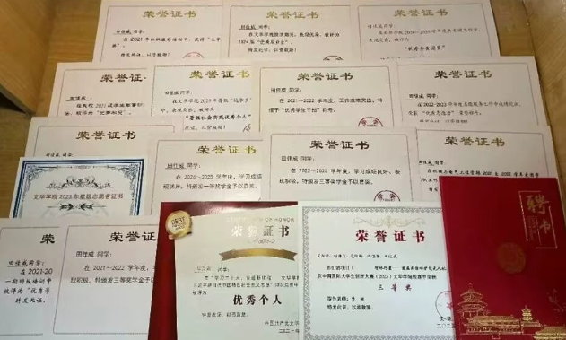 凭借高效学习规划和不懈努力,田佳威斩获多项荣誉:先后获评2022-2023学年度校级三等奖学金、2024-2025学年度校级一等奖学金,2024年获评校级“优秀毕业生”,以硬核成绩证明了自身学习能力。