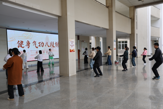 课堂上,教职工学员们跟随老师认真练习,从“两手托天理三焦”到“背后七颠百病消”,一招一式舒展到位。大家在舒缓的音乐与均匀的呼吸中调养气息、舒缓压力,现场氛围轻松和谐。参与教师纷纷表示,八段锦节奏适中、便于日常练习,既能放松身体,又能提升精气神,是非常实用的健身方式。